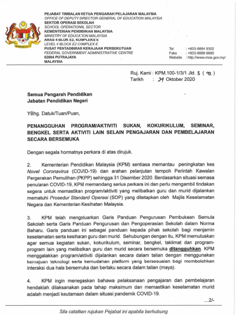 Penangguhan Program Aktiviti Sukan Kokurikulum Seminar Bengkel Serta Aktiviti Lain Selain Pengajaran Dan Pembelajaran Secara Bersemuka Pdf