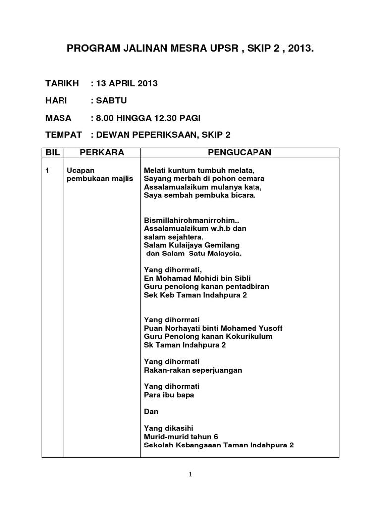PembukaanAluan Assalam mualaikum warahmatullah hibarakatuh Slideshare uses cookies to improve functionality and performance and to provide you with relevant advertising. TEKS PENGACARA MAJLIS PENUTUPAN DAN PENYERAHAN KEMBALI KELUARGA ANGKAT PROGRAM BINA INSAN GURU FASA 4 SIRI 2013. Berikut adalah teks pengacara majlis mc untuk majlis program solat hajat perdana peringkat sekolah menengah dan rendah.