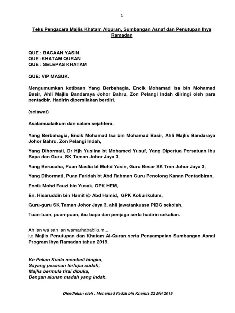 Teks Pengacara Majlis Penutupan Dan Khatam Alquran Serta Penyampaian Sumbangan Asnaf Program Ihya Ramadan 2019 Pdf