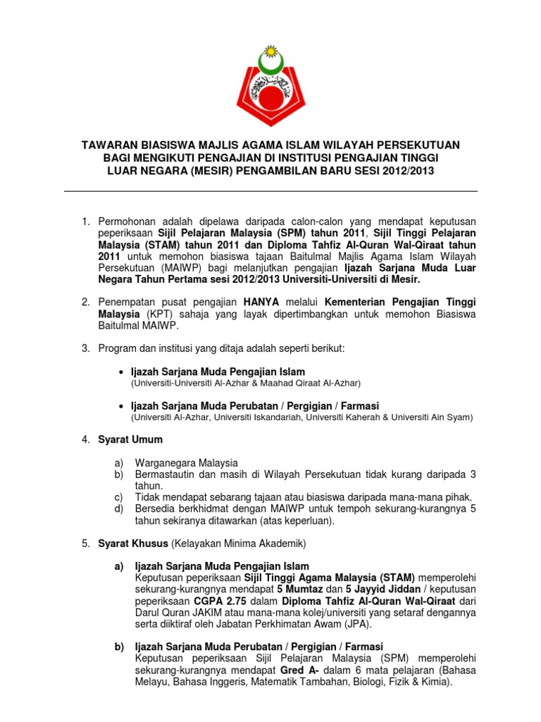 Borang permohonan boleh didapati bermula 9 April 2012 dengan memuat turun dari laman web rasmi Majlis Agama Islam Wilayah Persekutuan MAIWP wwwmaiwpgovmy. MAJLIS AGAMA ISLAM WILAYAH PERSEKUTUAN BAGI MENGIKUTI PENGAJIAN DI INSTITUSI PENGAJIAN TINGGI LUAR NEGARA MESIR PENGAMBILAN BARU SESI 20202021. Tawaran Biasiswa Baitulmal Majlis Agama Islam Wilayah Persekutuan MAIWP 2013 untuk Pengajian Luar Negara Mesir dibuka kepada lepasan Sijil Pelajaran Malaysia SPM 2012 Sijil Tinggi Agama Malaysia STAM 2012 dan Diploma Tahfiz Al-Quran Wal-Qiraat 2012 bagi melanjutkan pengajian Ijazah Sarjana Muda Luar Negara.