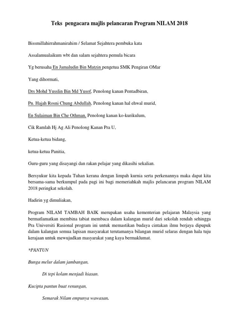 Teks Pengacara Majlis Pelancaran Program Nilam 2018