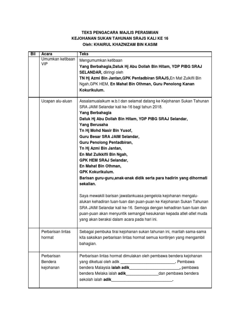 Tam weng wah ketua pengarah biro pengaduan awam jabatan perdana menteri program mesra rakyat wilayah persekutuan dataran ppr seri semarak jalan semarak kuala lumpur 14 julai 2012 sabtu terima kasih saudara i pengacara majlis. Teks Ucapan Aluan Sukan. Teks ucapan alu aluan ybhg.