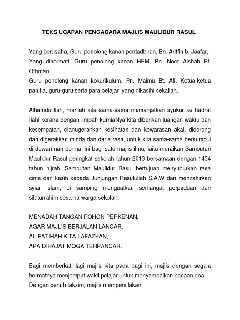 Berikut adalah teks pengacara majlis mc untuk majlis sambutan maulidur rasul peringkat sekolah menengah dan rendah. Pergi ke pasar membeli ikan Ikan dimasak diatas bara Selamat datang kami ucapkan Ucapan bismillah pembuka acara Dimulakan lafaz dengan nama Allah Tuhan Ilahi dimohonkan limpahan berkat akan segala nikmat yang diberi. Teks ucapan yab ketua menteri melaka sempena majlis sambutan maulidur rasul peringkat daerah alor gajah tahun 2016m1437h 24 januari 2016 ahad jam 0800 pagi wakil.