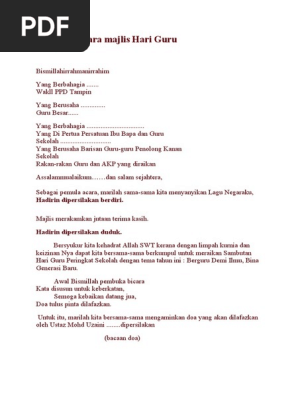 Teks pengacara majlis untuk acara tukar hadiah. Kata Aluan Pengacara Majlis. TEKS PENGACARA MAJLIS HARI KELUARGA PPD KERIAN 2018 PERSARAAN TN. Mengadap duli yang maha mulia sultan ibrahim ibni almarhum sultan iskandar sultan dan yang dipertuan bagi negeri dan jajahan takluk johor darul tazim patik mohon perkenan duli yang maha mulia tuanku untuk patik memulakan aturcara majlis.