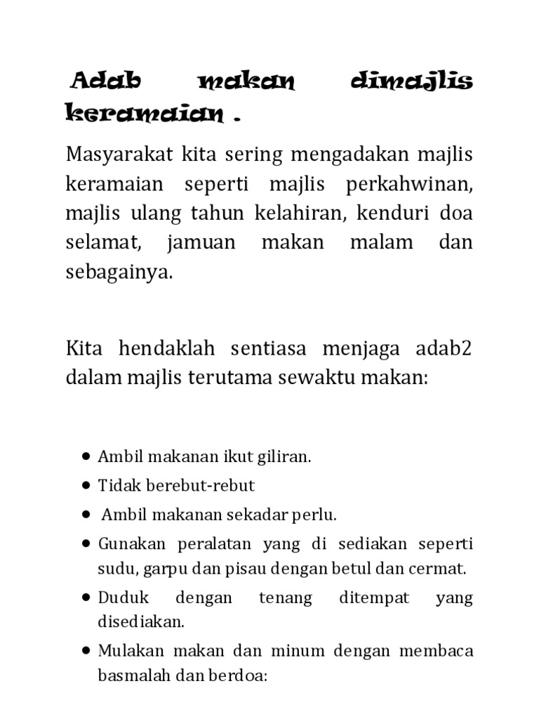 Kita sudah dibiasakan dengan budaya dan amalan ini sejak dari zaman sekolah lagi di mana majlis seperti perhimpunan sekolah akan dimulakan dengan bacaan doa yang. Majlis keramaian tidak dibenarkan di Pahang. Rasmi dan majlis keramaian seperti majlis perkahwinan manakala silat daripada jenis buah pukul atau seni tempur pula lebih banyak disorokkan daripada pandangan ramai atas dasar dasar memelihara seni muslihat permainan dan beberapa alasan yang lain masakan indonesia adalah salah satu tradisi kuliner yang paling kaya di dunia dan penuh dengan cita.