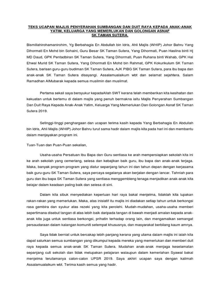 Teks Ucapan Majlis Penyerahan Sumbangan Dan Duit Raya Kepada Anak Pdf